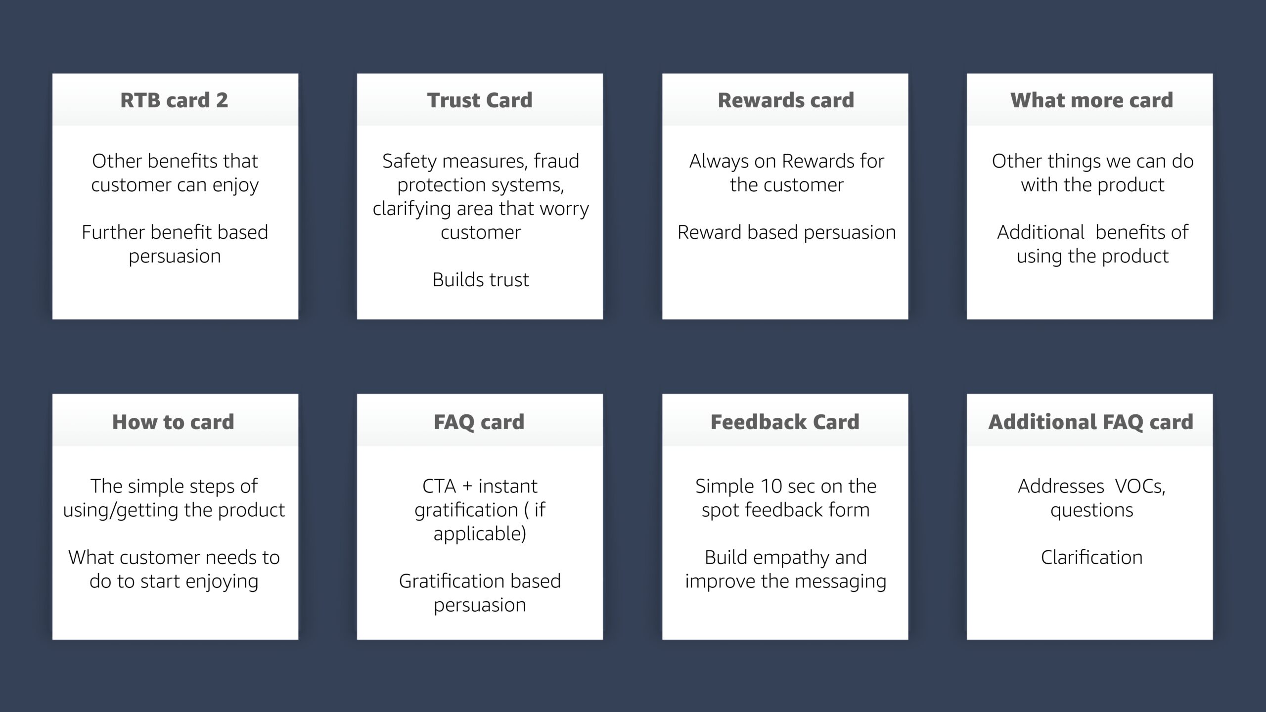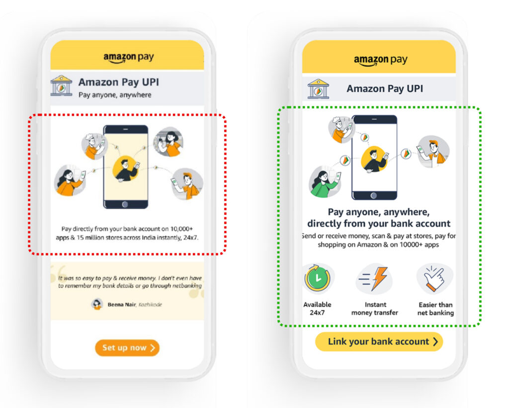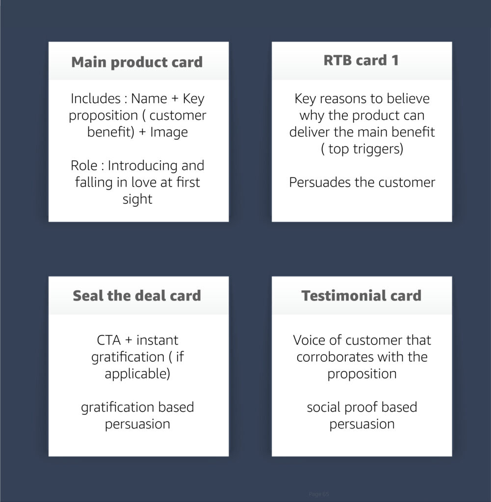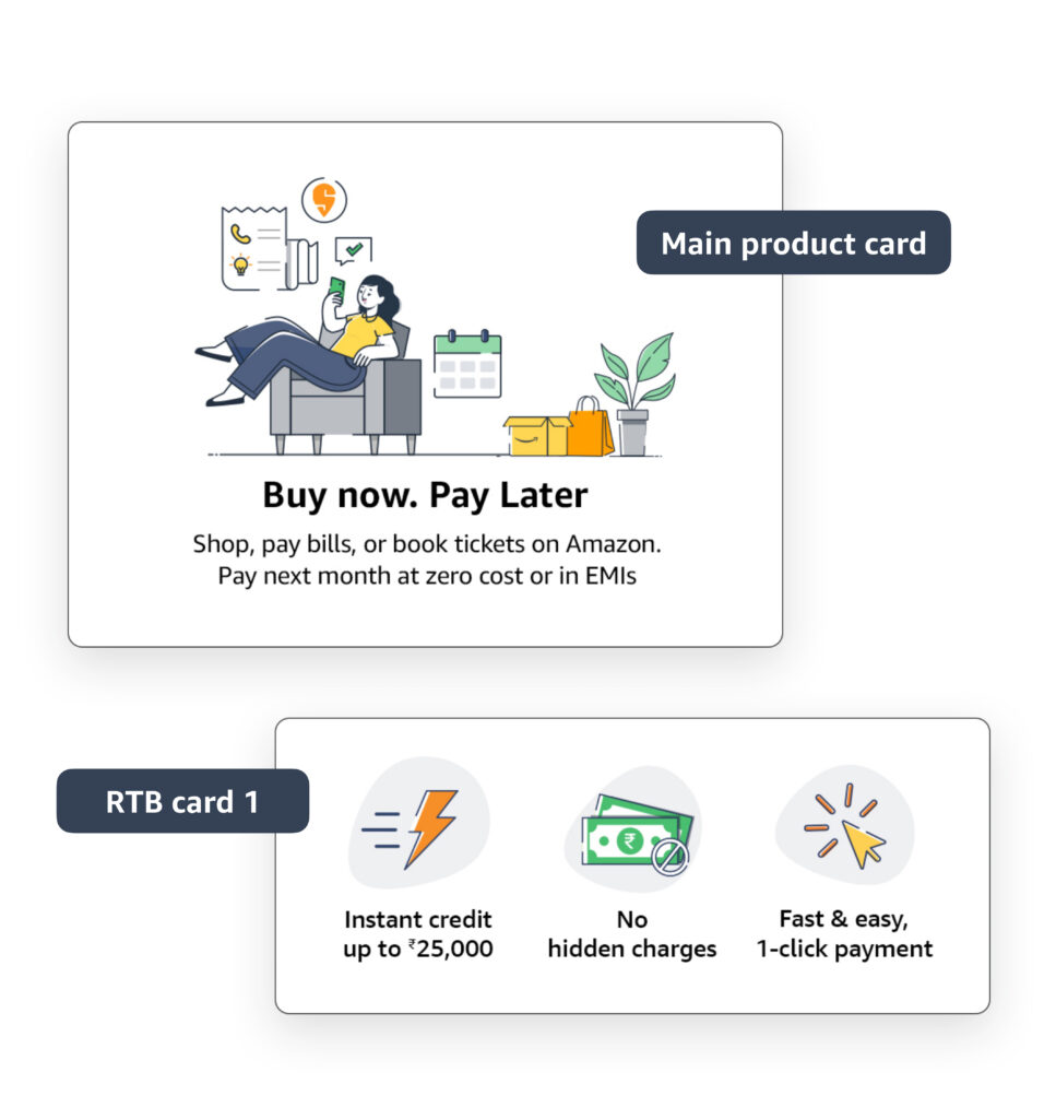 | Lack of Information architecture. Challenge lies in structuring of information, not lack of it , not persuasive enough. “Customers read less, visually grasp more” – Voice of expert. | Create sharp content hierarchy. Building blocks : CARDS approach .via the Amazon Pay pillars ( Trust, Convenience, Rewards) and be consistent to build memory. |