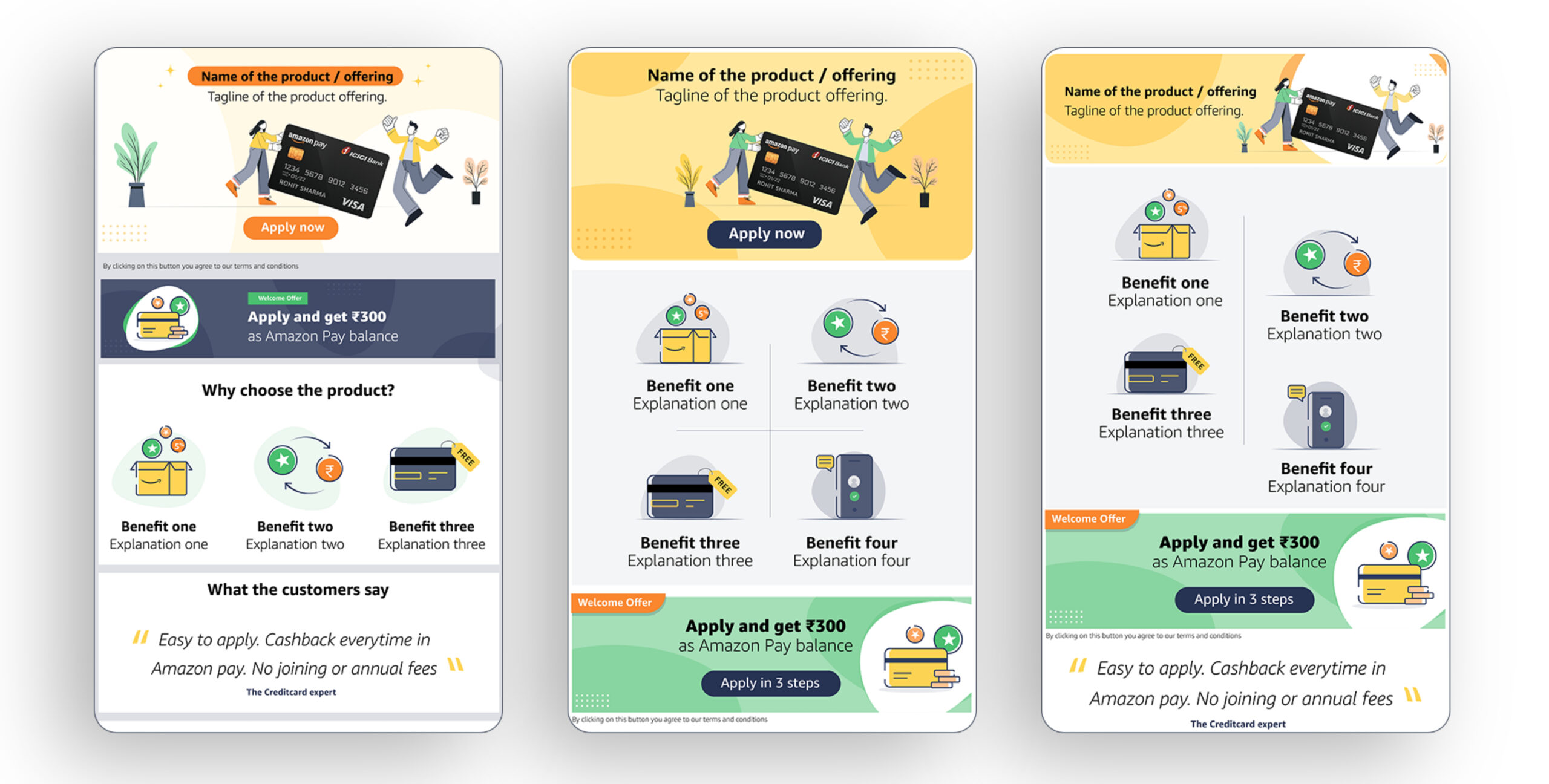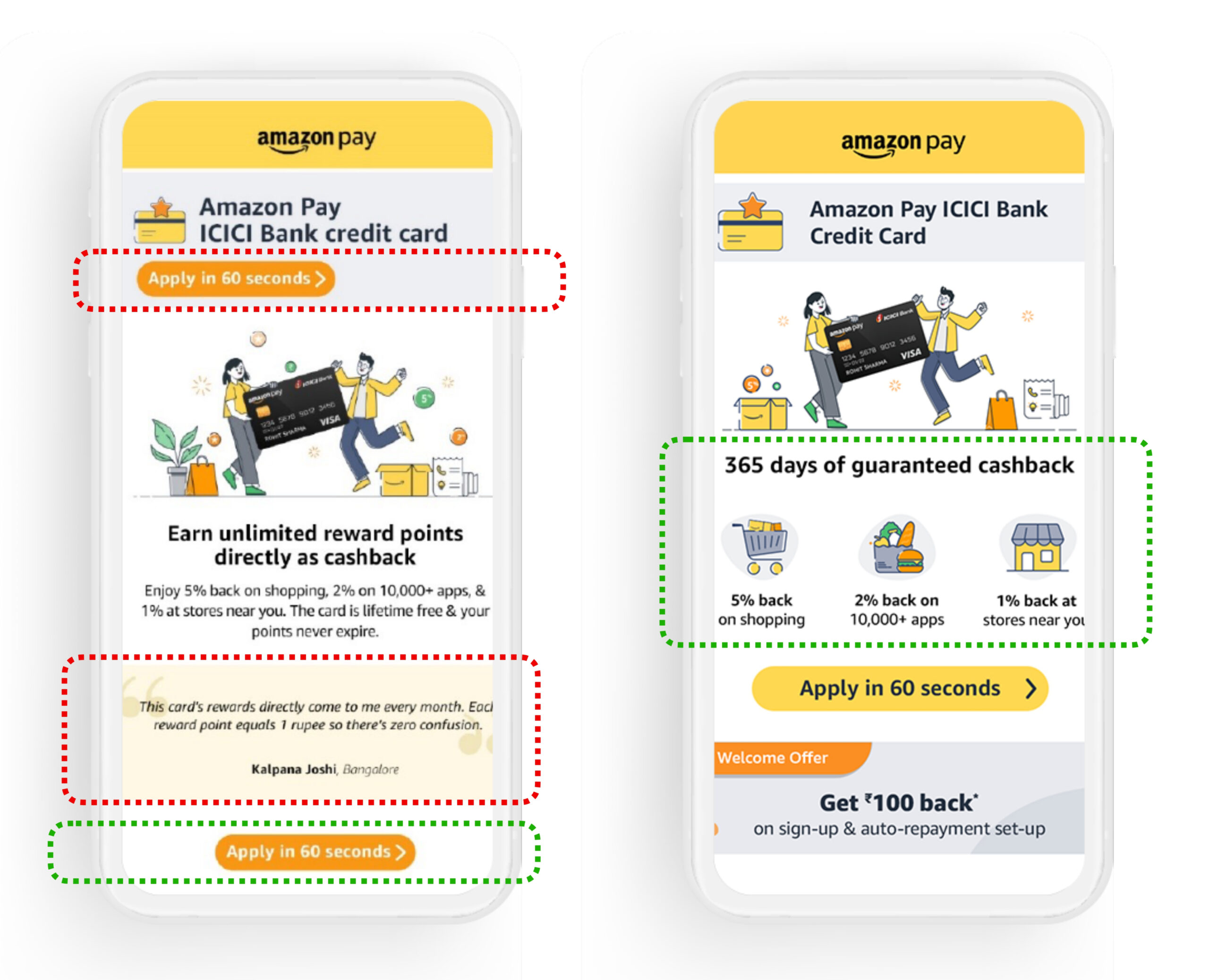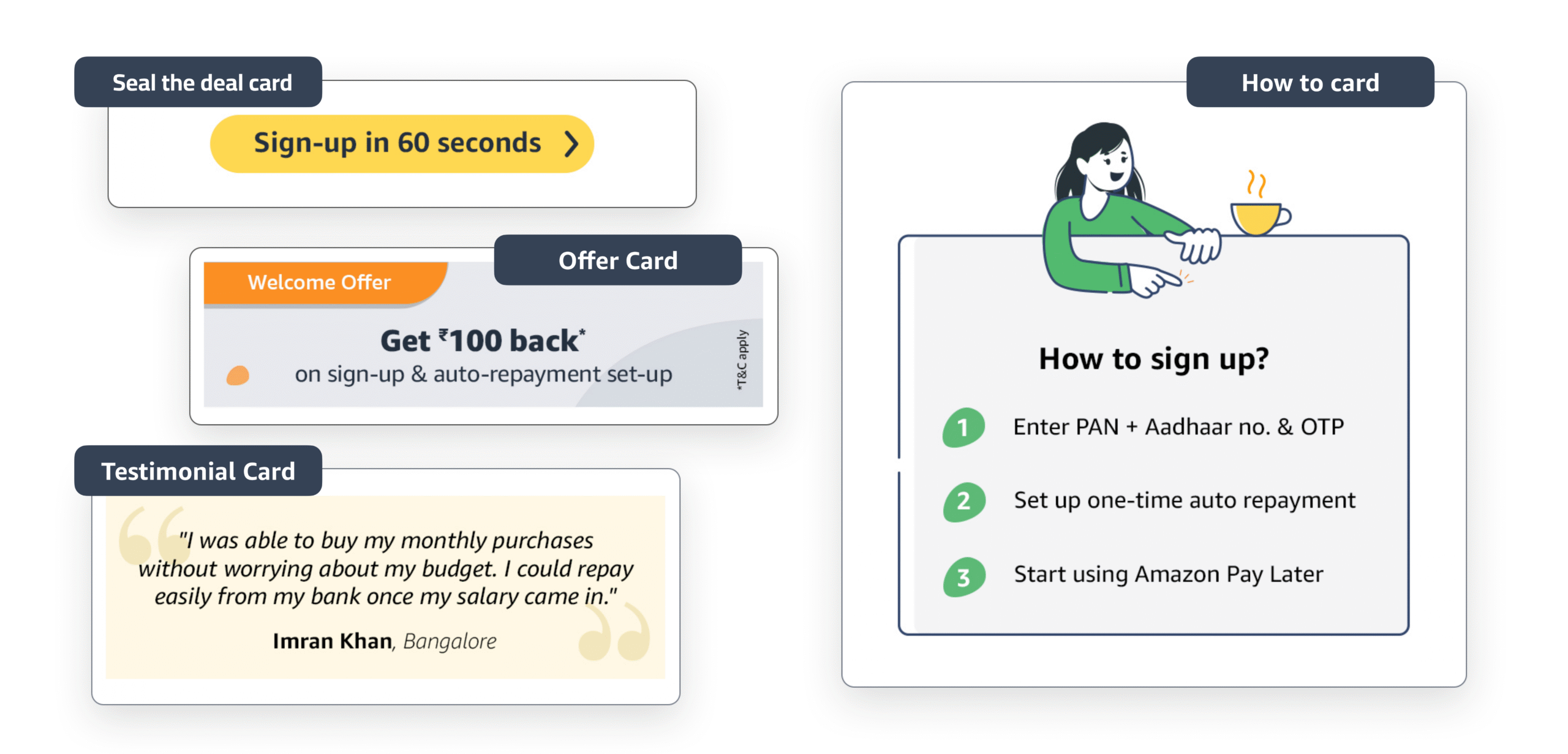 | Lack of Information architecture. Challenge lies in structuring of information, not lack of it , not persuasive enough. “Customers read less, visually grasp more” – Voice of expert. | Create sharp content hierarchy. Building blocks : CARDS approach .via the Amazon Pay pillars ( Trust, Convenience, Rewards) and be consistent to build memory. |